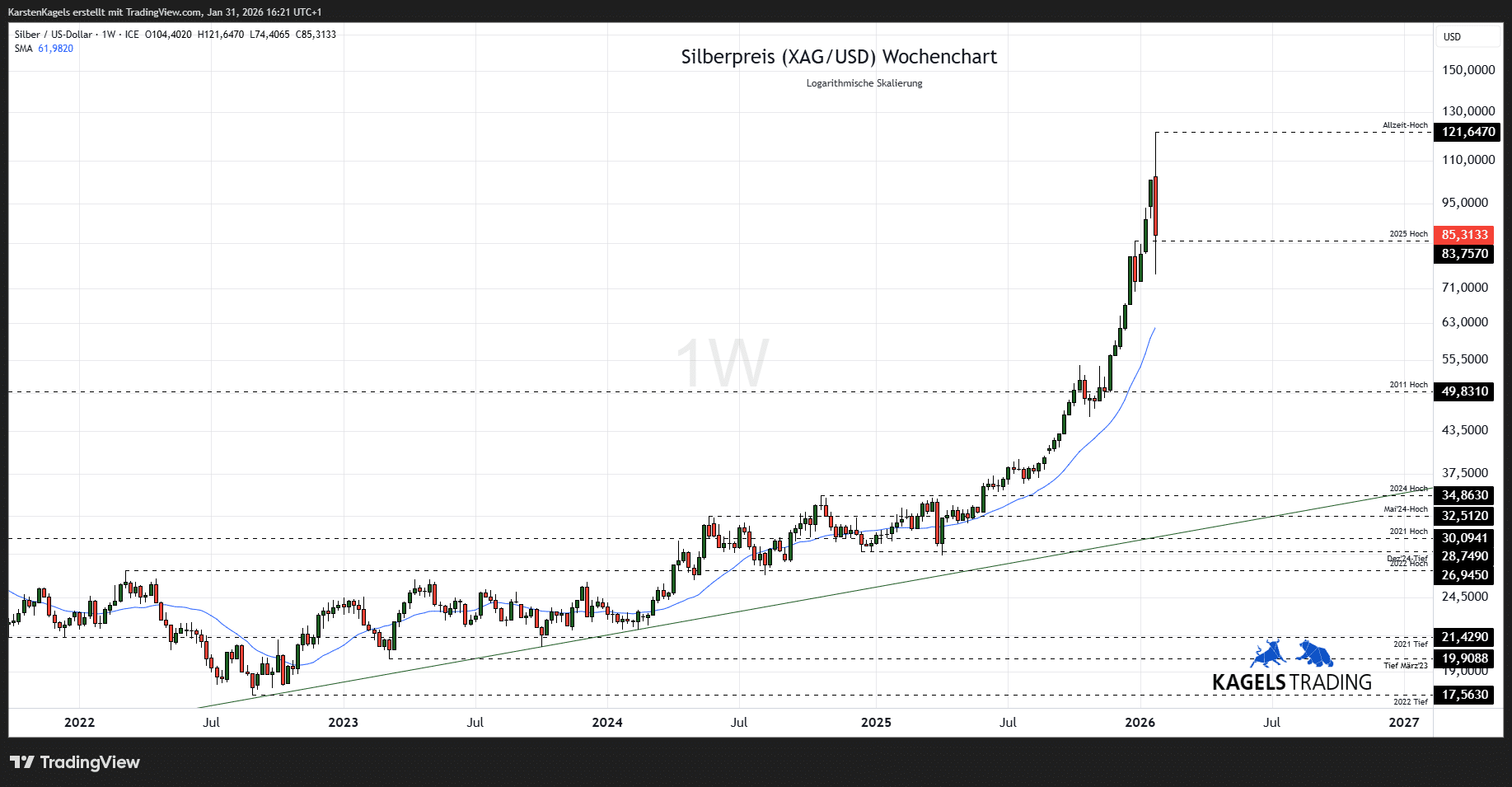 Das im zweiten Halbjahr 2025 etablierte Ausbruchsszenario setzte der Silberpreis nach dem Jahreswechsel mit erhöhtem Tempo bis zu einem Rekordwert bei $121 fort. Der Abstand zur Durchschnittsbewertung sowie aufgelaufene Gewinne haben zum Ende der vergangenen Woche jedoch zu einer kräftigen Entladung geführt.