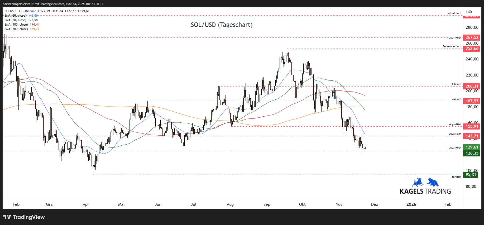 Rückblick: Zum Start in das Jahr 2025 konnte Solana noch einen neuen Höchstwert bei $295 setzen. Die folgende Korrektur ist jedoch bis unter $100 zurückgekommen. Vom letzten Tief hat der Kurs in eine Erholung zurück über die gleitenden Durchschnitte gedreht, die jedoch im September in eine Abwärtsbewegung übergegangen ist. Momentan steht der $125er-Bereich unter Druck.