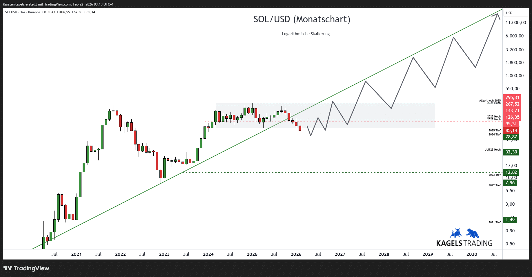 - Solana Prognose kurzfristig: Vom Septemberhoch des vergangenen Jahres ist der Kurs in eine Korrekturphase übergegangen, die zuletzt aus einer Konsolidierung nach unten ausgebrochen ist und Verluste bis in den $60er-Bereich bilden könnte.