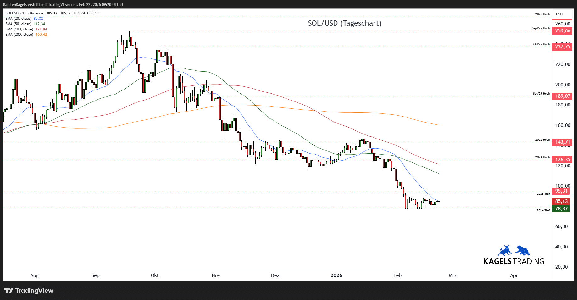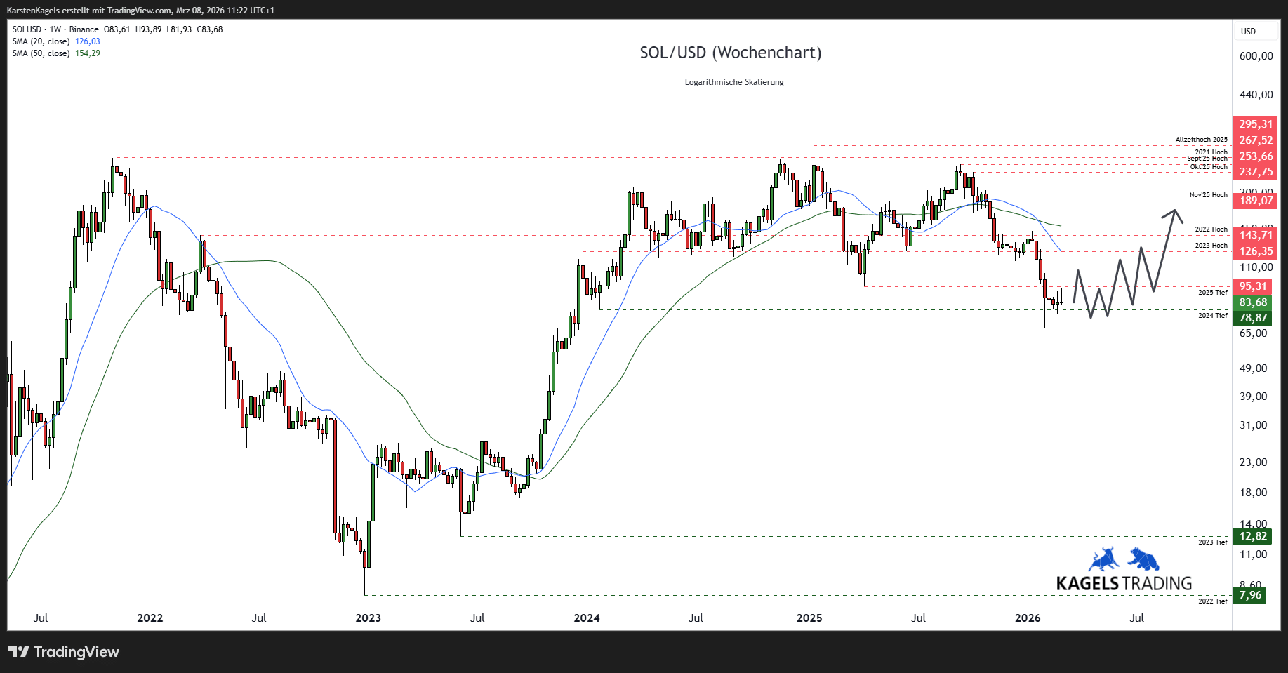 Kurze Rückschau: Vom Tief des Jahres 2022 konnte der Kurs von Solana eine Umkehrstruktur ausbilden und die $100-Marke zurückgewinnen. Mit dem 2024er-Jahrestief wurde die Untergrenze einer breiten Seitwärtsphase zwischen 78 und 295 US-Dollar gesetzt. Die wichtigste Unterstützung liegt zunächst am Jahrestief aus 2024.