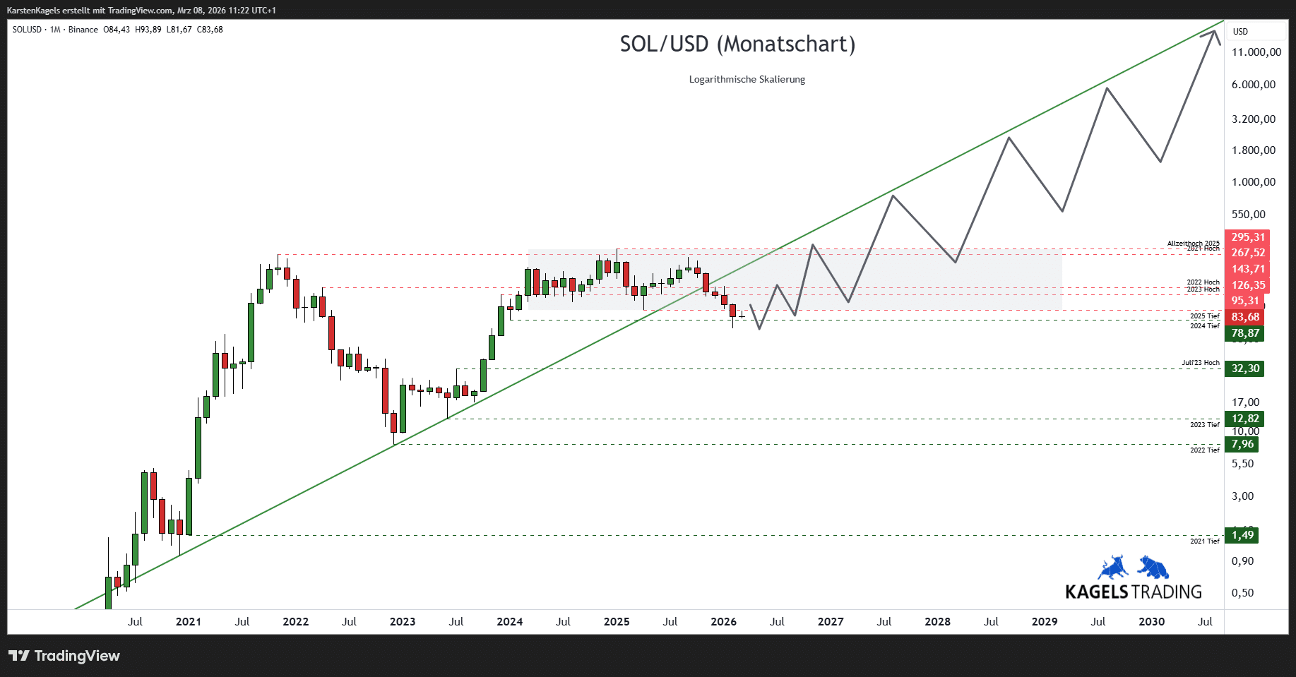 Prognose: In der aktuellen Situation ist der etablierte Trendwinkel gebrochen und die Tradingrange über $80 dürfte sich fortsetzen. Erst ein Ausbruch auf der Oberseite würde für Solana Ziele über $300 aktivieren.
