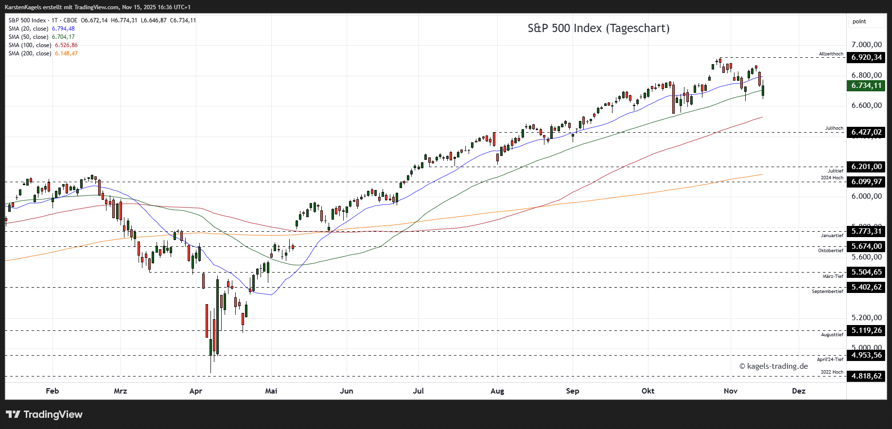 Kurze Rückschau: Der S&P hat im Jahr 2024 eine eindrucksvolle Rallye gezeigt, die bis in Dezember hinein eine Serie neuer Rekorde bilden konnte. Über den Jahreswechsel hat sich dann eine Schiebephase gebildet, vom letzten lokalen Hoch aus dem Februar ist der Kurs dann in den Korrekturmodus gegangen. Nach Bruch der 200-Tage-Linie hat sich die zweite Welle am 2022er Jahreshoch gestützt, woraufhin der Kurs mit ebenso deutlicher Dynamik zurückgekommen ist und über der 6.600-Punkte-Marke notiert.