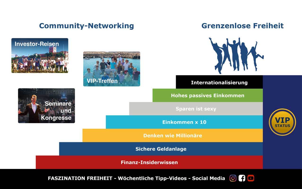 - Zugang zum VIP-Club: Umfasst jährlich 10-12 VIP-Seminare mit neuen Geldanlagen und brisanten Themen plus E-Mail-Support.