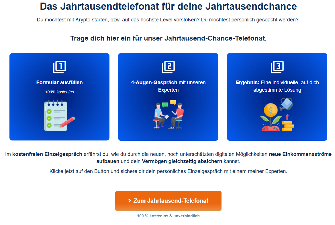 Diesbezüglich findest du auf der Startseite von kryptopowerhouse.com einen Link, über den du ein kostenloses Erstgespräch vereinbaren kannst. Und so läuft die Anmeldung ab:
