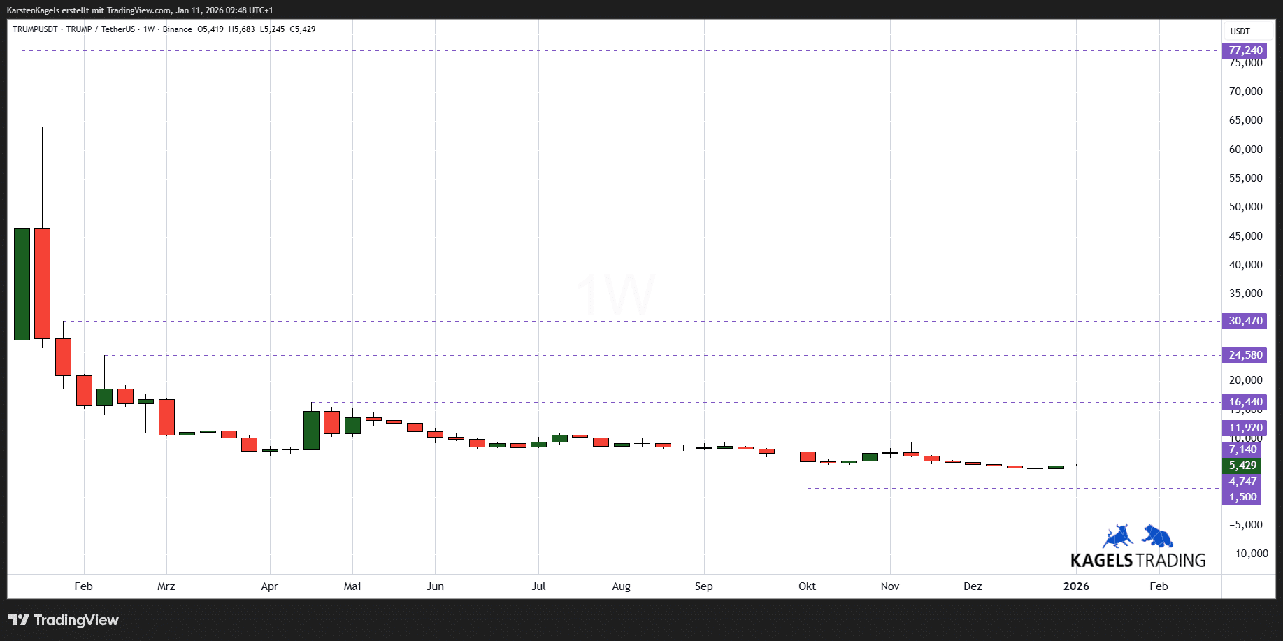 Prognose/Ausblick: Nach einem guten Start hat der Kurs in den folgenden Handelswochen für Ernüchterung gesorgt. Die anfänglichen Gewinne konnte der Meme-Coin $TRUMP nicht halten und ist unter die $10er-Marke gebrochen. Auch das letzte Tief musste dem jüngsten Korrekturdruck weichen, der Kurs pendelt nach einem neuen Tiefpunkt bei $1,50 im Fünf-Dollar-Bereich.