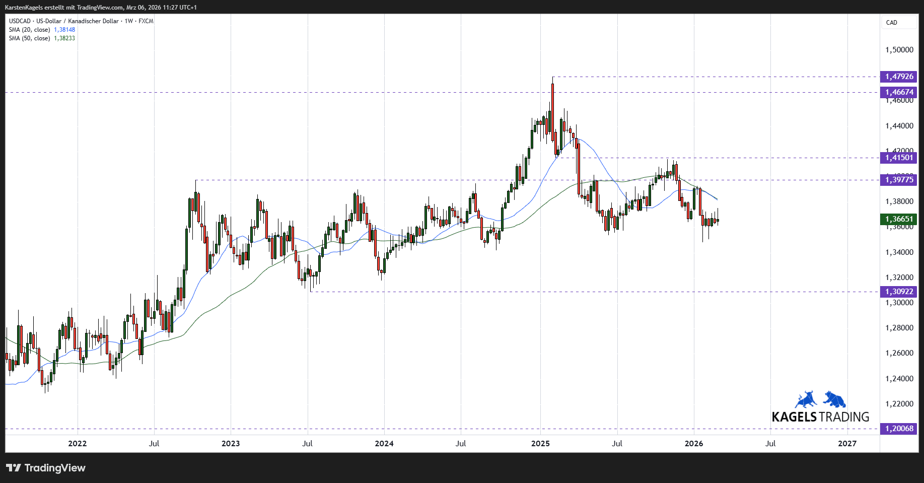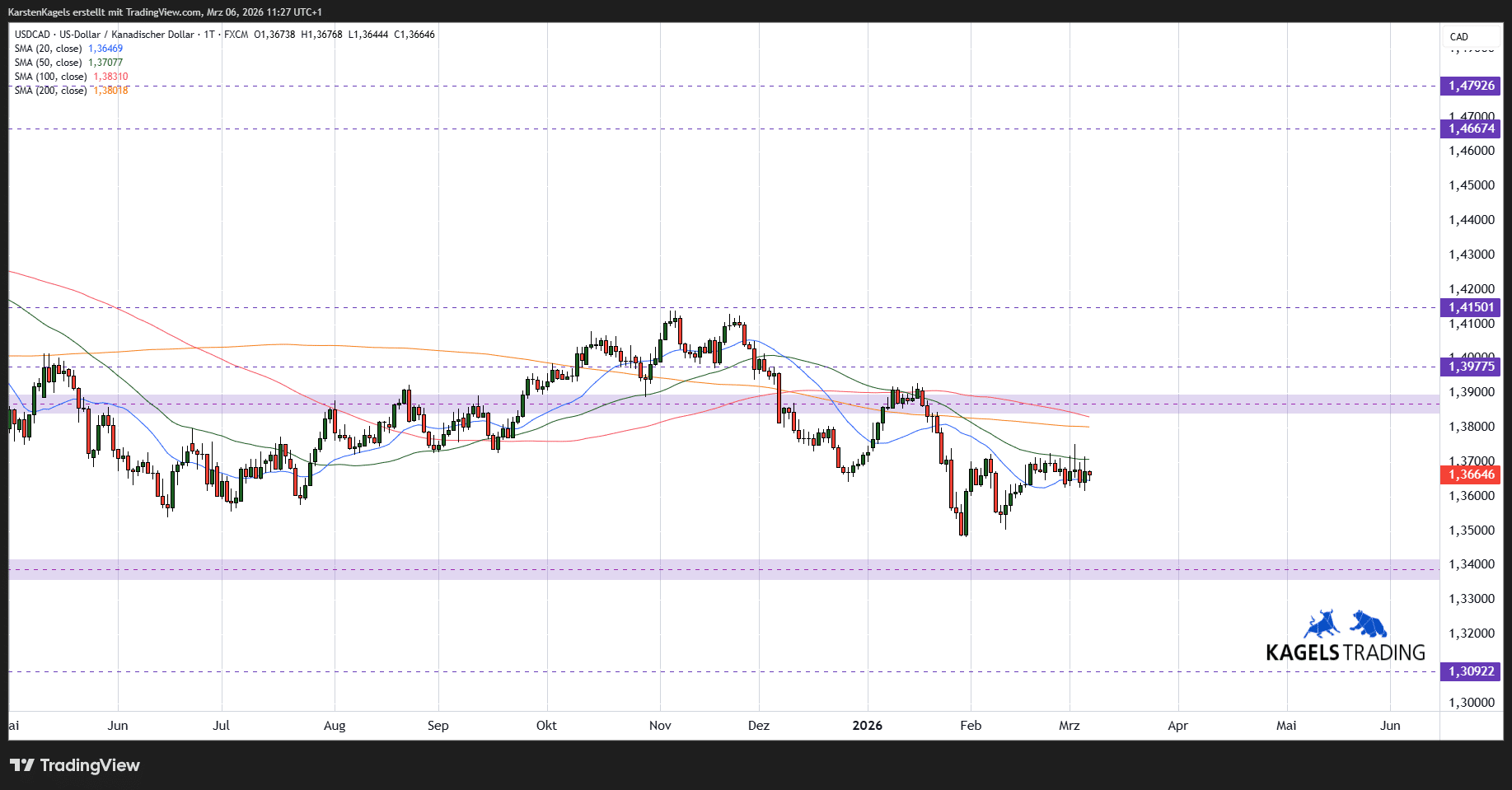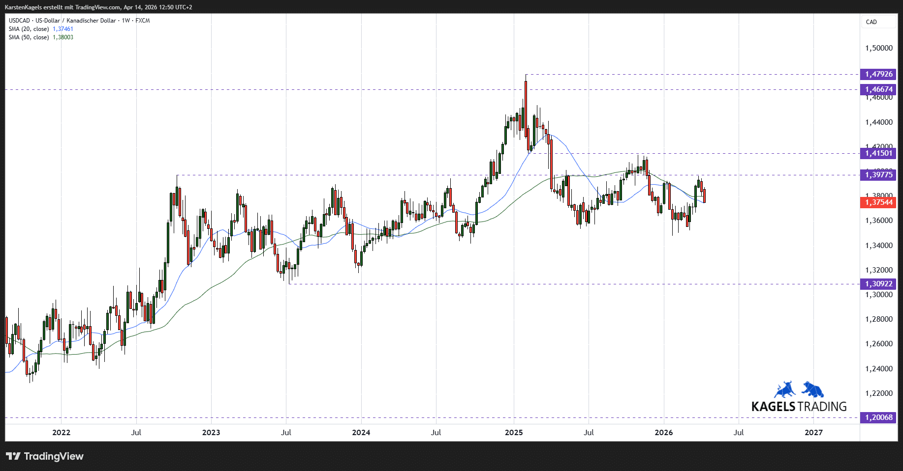 Eine hervorragende Übersicht über die technische Situation des US-Dollar/Kanadischer Dollar Währungspaares findet sich hier auf TradingView.