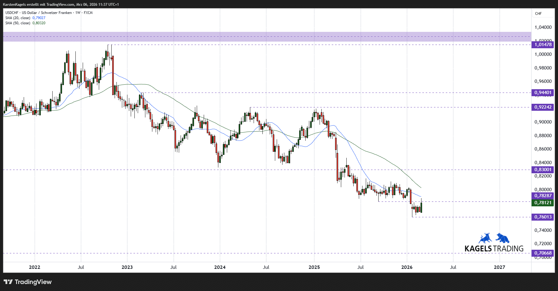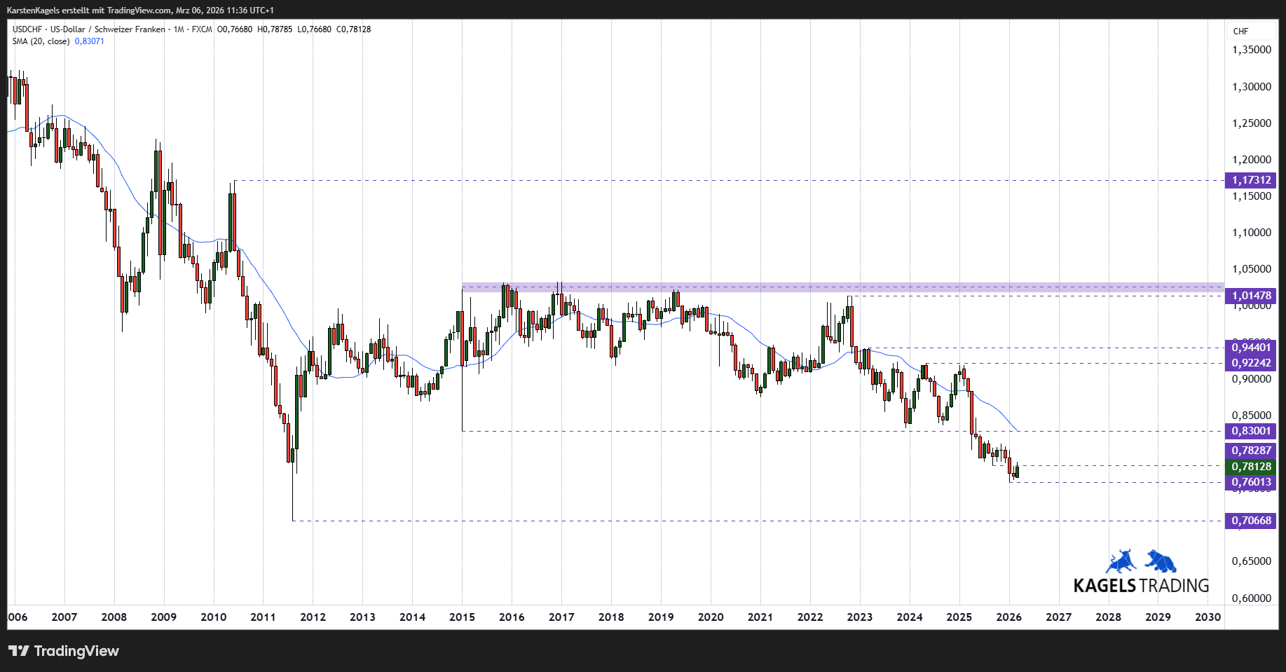 Eine hervorragende Übersicht über die technische Situation des US-Dollar/Schweizer Franken Währungspaares findet sich hier auf TradingView.