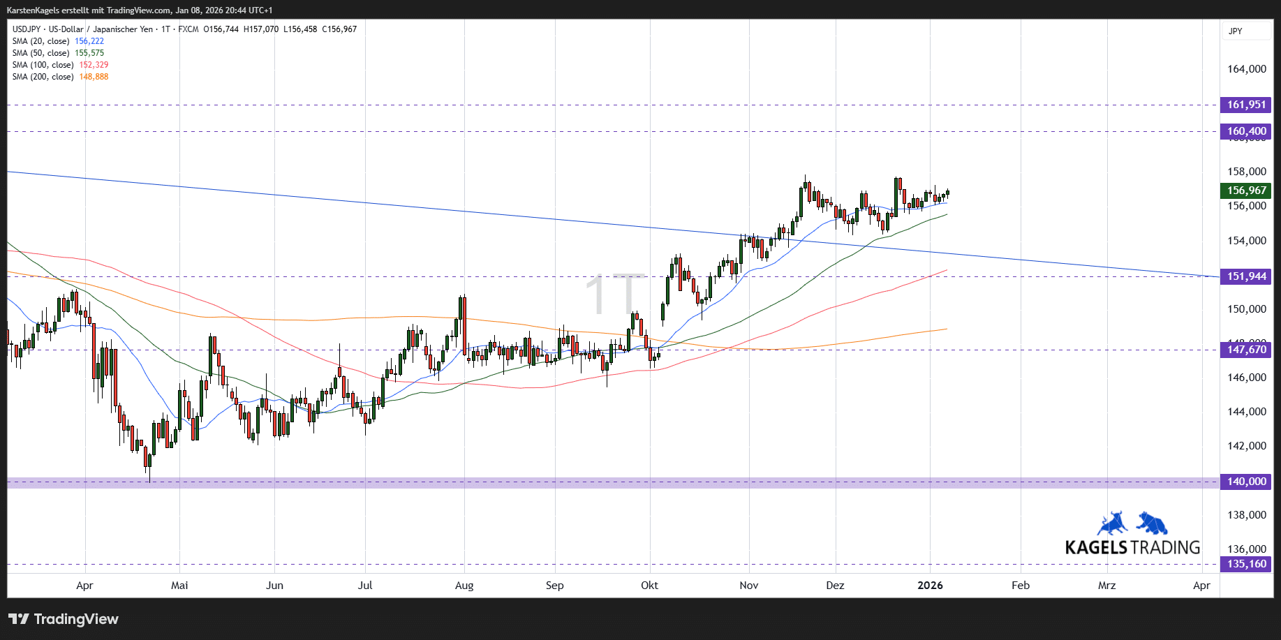 Ausblick und Prognose: Der Kursverlauf im kurzfristigen Chartbild vollzieht einen Ausbruch aus der Tradingrange, wobei die Stabilisierung über der blauen Trendlinie jetzt Potenzial für Kursziele bei 158 und 160 Yen bietet.